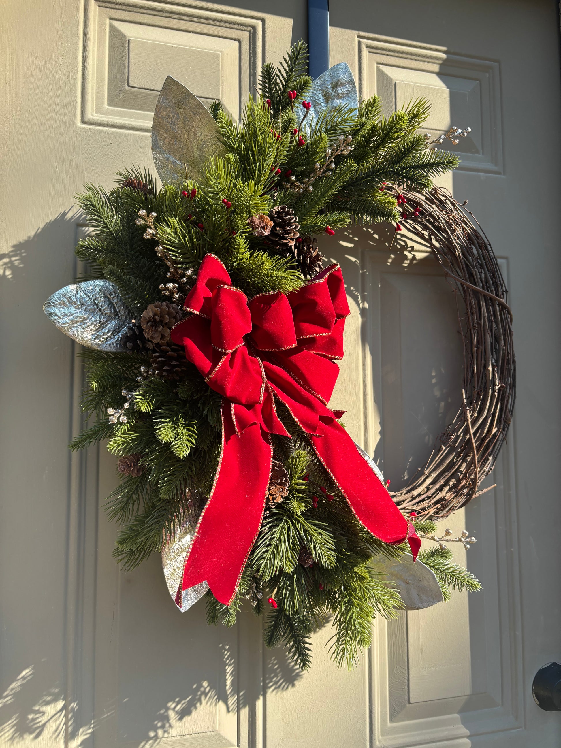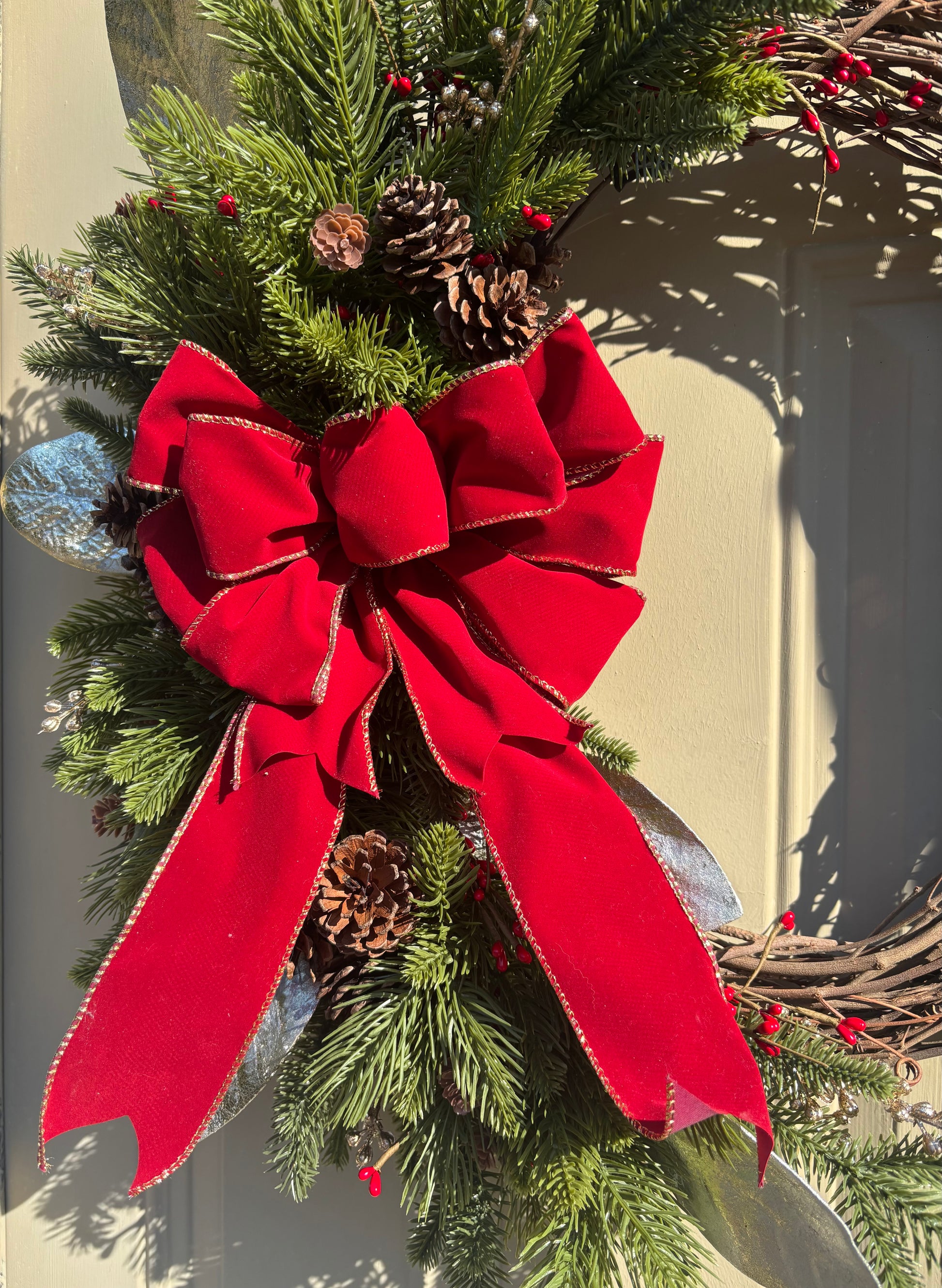 Elevate your holiday décor with this classic holiday wreath featuring a striking cranberry red bow edged in gold. Crafted with lush, realistic pine sprigs, it is beautifully accented by gold glitter berries, magnolia leaves, pinecones, and vibrant red berries, creating a timeless and elegant front door statement that welcomes guests with festive warmth and sophistication.
