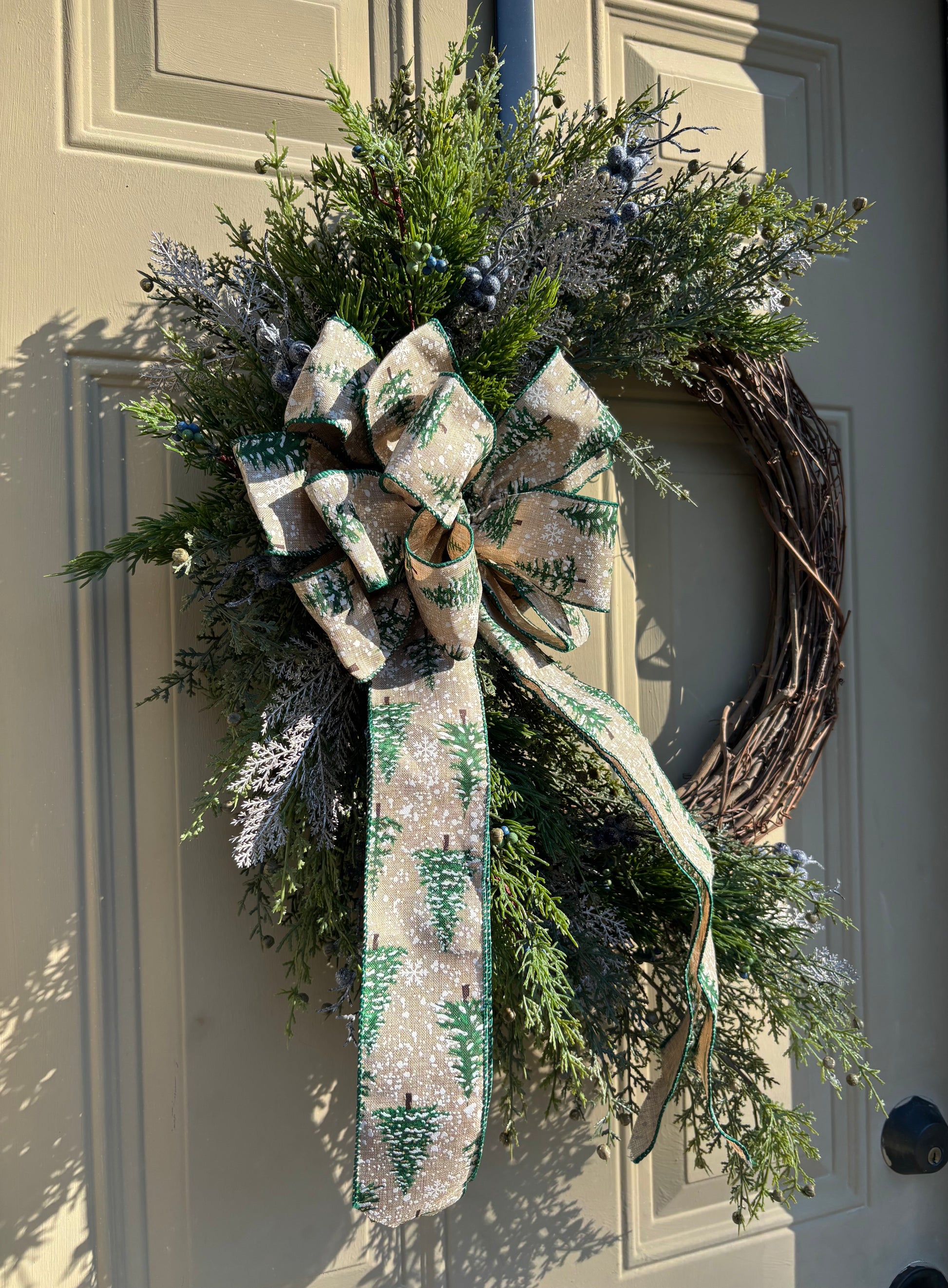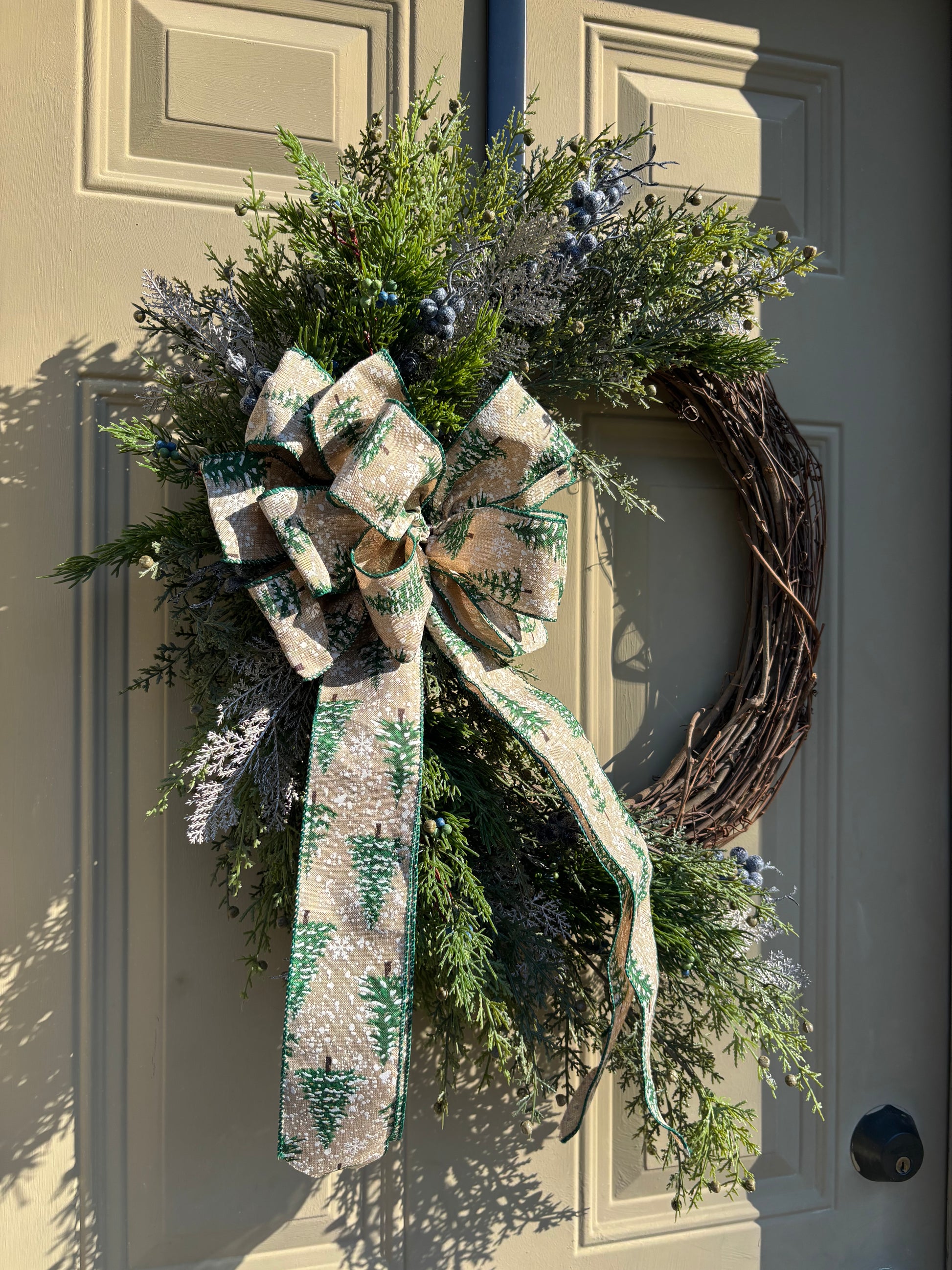 Celebrate the season with this expertly crafted wreath. It features lush green cedar and juniper, complemented by sparkling blue berries and champagne cedar that add a touch of natural elegance. A festive bow completes the design, enhancing your front door with timeless charm that lasts throughout the season.