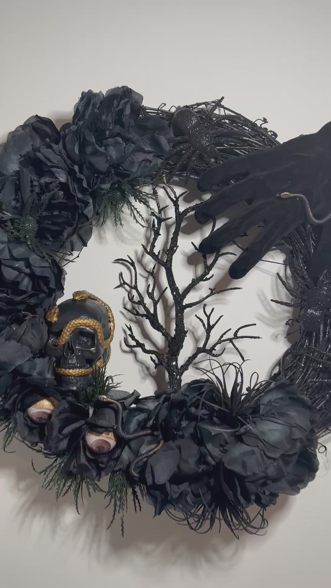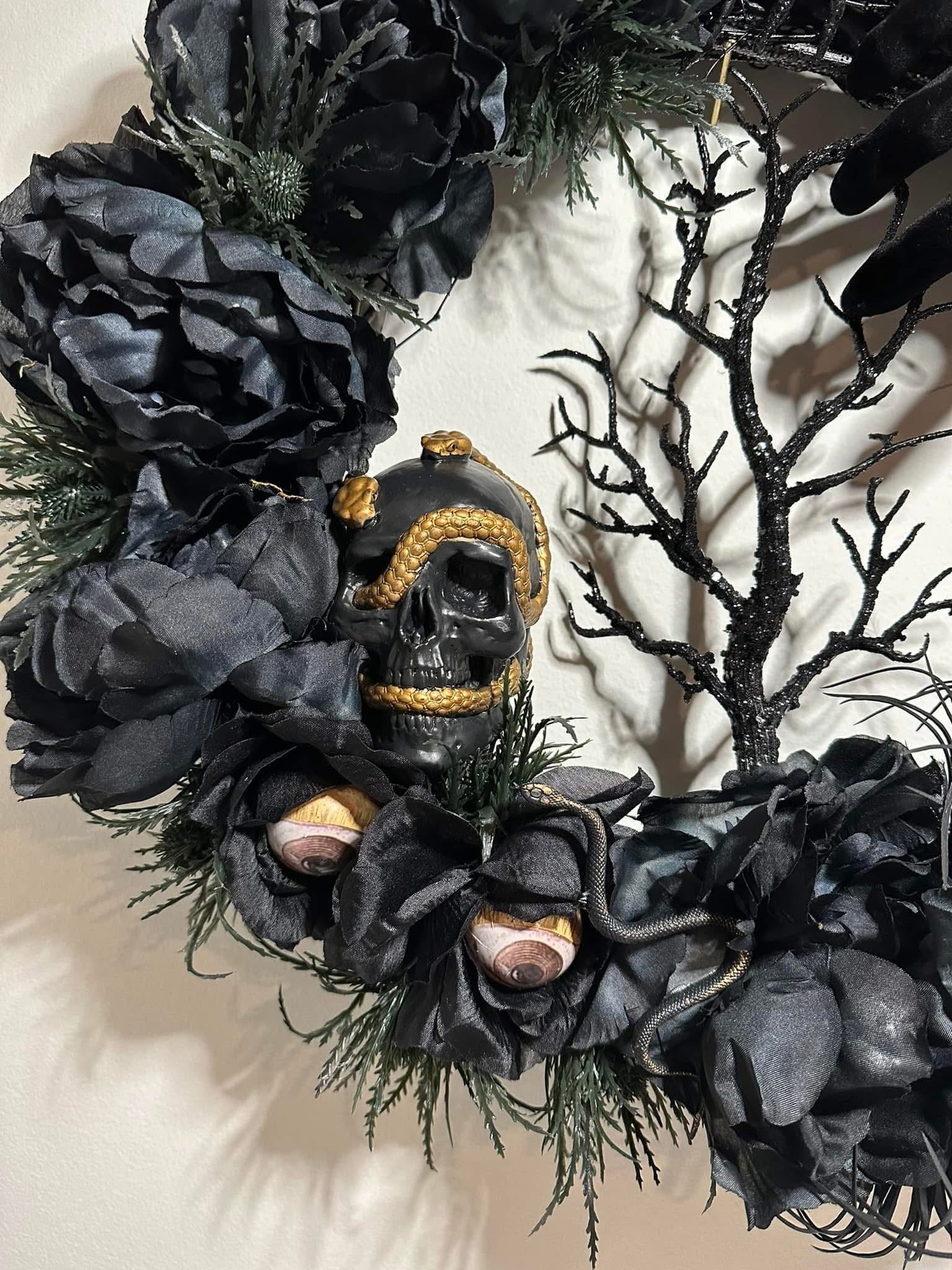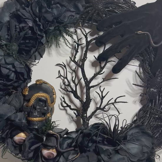 Elevate your Halloween decor with this creepy crafted wreath featuring a black-painted glitter grapevine base. Adorned with skulls, snakes, and spiders, it offers a striking black floral combination that perfectly captures the spooky spirit of October. Ideal for front doors, this wreath sets an eerie and sophisticated tone for all your seasonal celebrations.